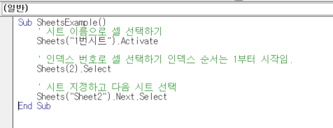 매크로 작업 시 1번 시트의 값을 2번 시트에 활용하거나 할때 사용됩니다. 시트 선택하는 코드도 필수 코드입니다.