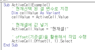 그림과 같이 현재 셀을 변수로 지정할 수도 있습니다. 그리고 현재 셀에 값을 넣을 수도 있어요. 여기서 offset이 정말 유용해요. 그림은 현재 선택된 셀에 ".offset"을 해주면 기준셀이 되고 "(상하, 좌우)"로 셀을 선택할 수 있어요. +값은 오른쪽, 위쪽이고 -값은 왼쪽,아래쪽입니다.