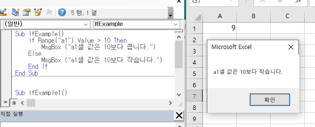 이 조건문은 "A1"셀의 값을 "9"로 적어 놓고 vba 코드에 if문을 적용시킨겁니다. 차근차근 첫 줄 부터 보겠습니다.