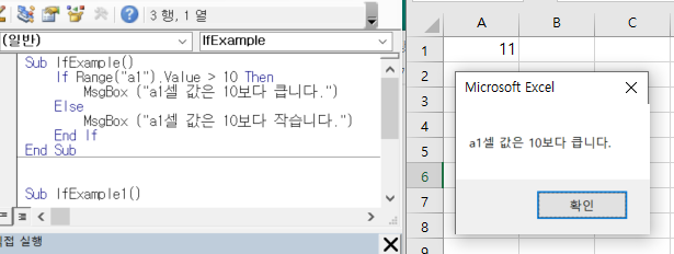 그러면 "A11"의 값을 11로 변경해보겠습니다. 해당 조건은 참이므로 알림은 "a1셀 값은 10보다 큽니다."이 뜨게 됩니다.