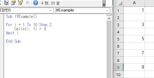 시작하는 수는 "1", 끝나는 수는 "10" , 띄워넘는 수는 "2"입니다. 그럼 엑셀상 결과 값은 그림과 같습니다. 그리고 반드시 for문 마지막에는 Next i 를 넣어주셔야 에러가 발생하지 않습니다. i를 number나 index로 하셨다면 Next number, Next index로 코드를 마무리 하셔야겠죠?