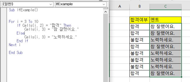 먼저 for문으로 3행에서 10행까지 루프를 만들고, 안에 if 조건문을 사용하여 멘트를 달았습니다. 예시는 간단하지만 if 와 for만 있으면 자동화 할 대상이 무궁무진해질 것입니다.
